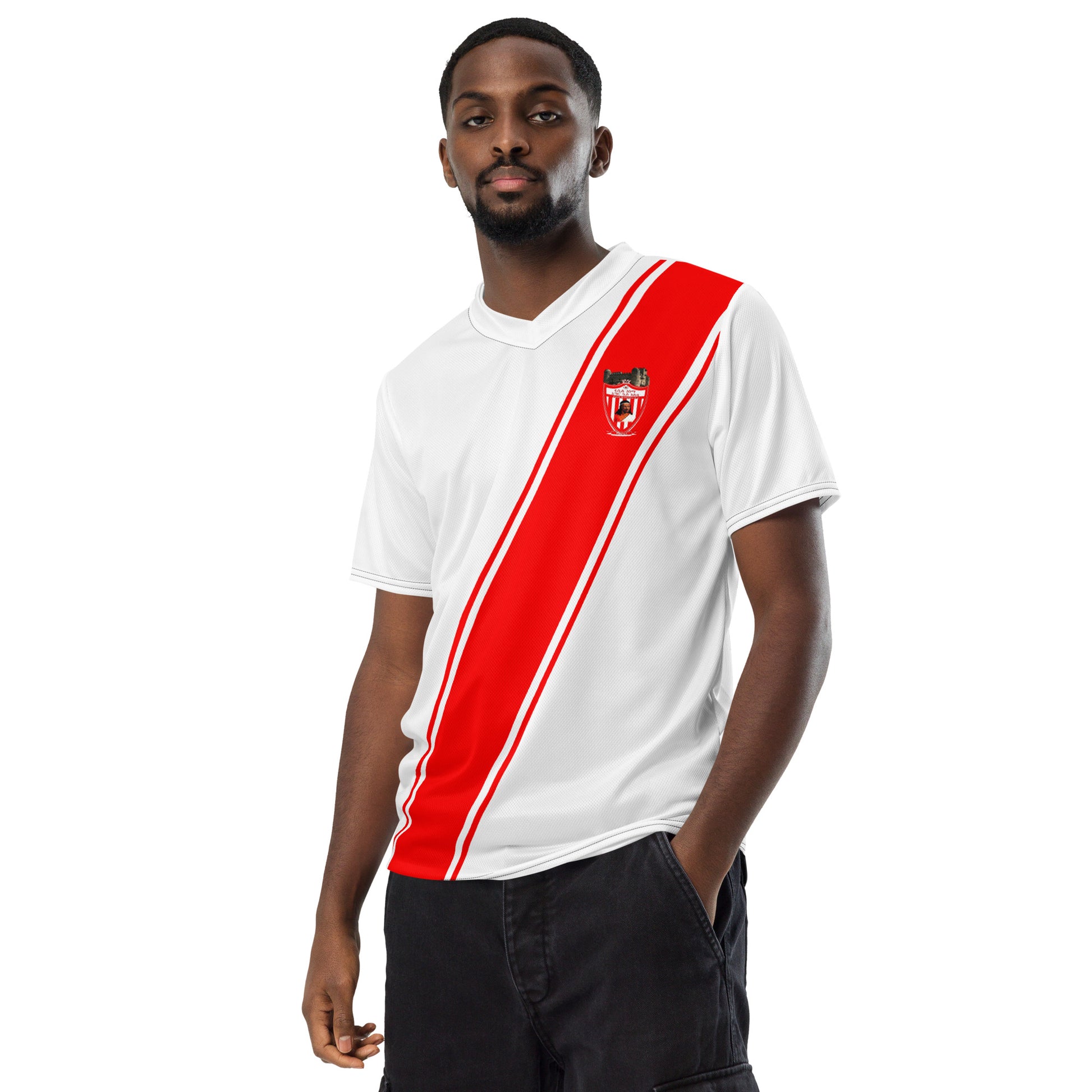 Looking for the perfect sports jersey? We have you covered—made of 100% recycled polyester fabric, this shirt is breathable, moisture-wicking, and has a double-layered v-neck collar that creates a premium look.